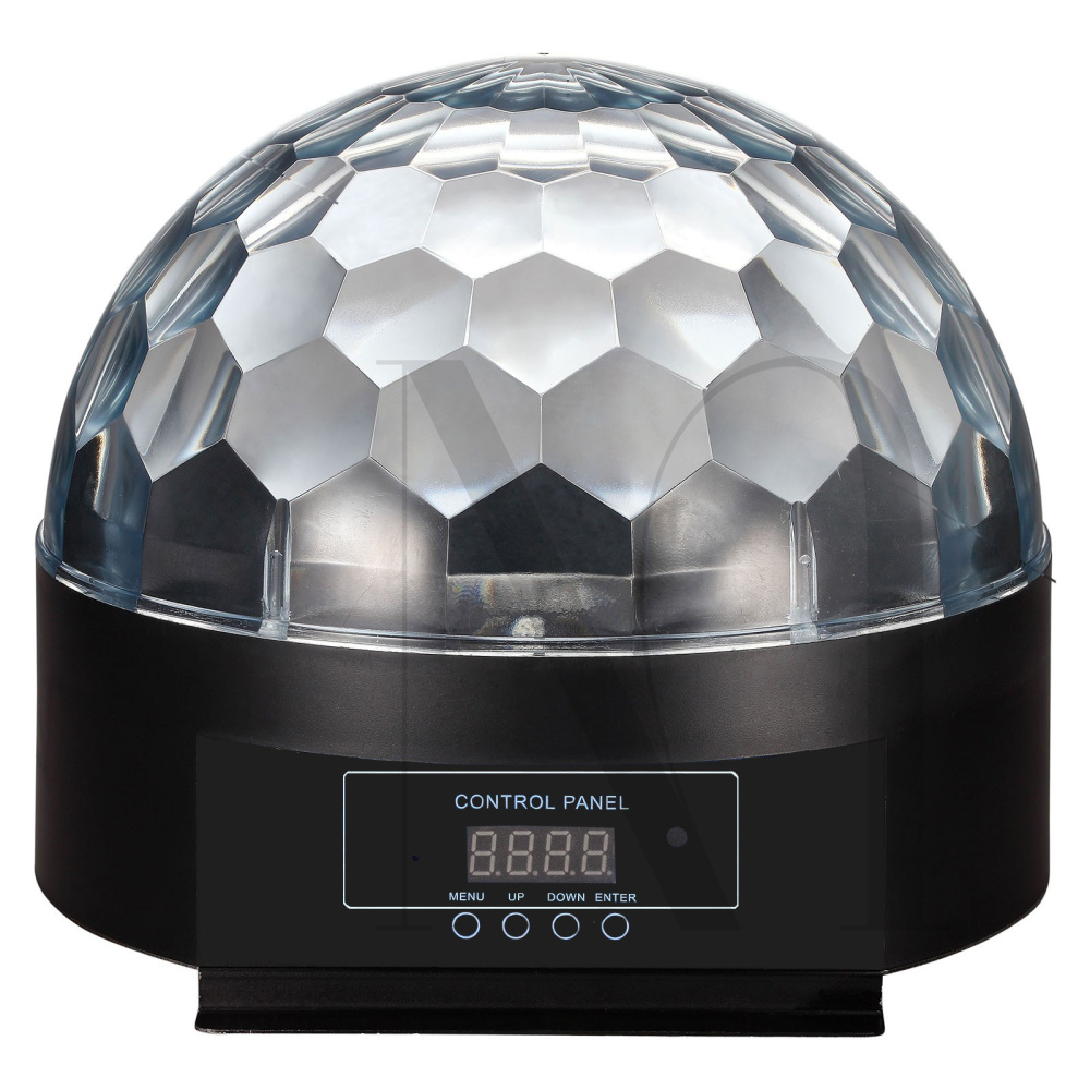 • 6 colors Red, Green, Blue, Violet, Yellow, White 3W LED• Clockwise and Counterclockwise rotation with speed• Sound-activated: light color and speed changes with the music• Programmable light color and speed through DMX 512 function (cable included)• Power Supply 100 - 240 V AC, 50 / 60 Hz, 18W• Dimensions 190 x 190 x 200cm
