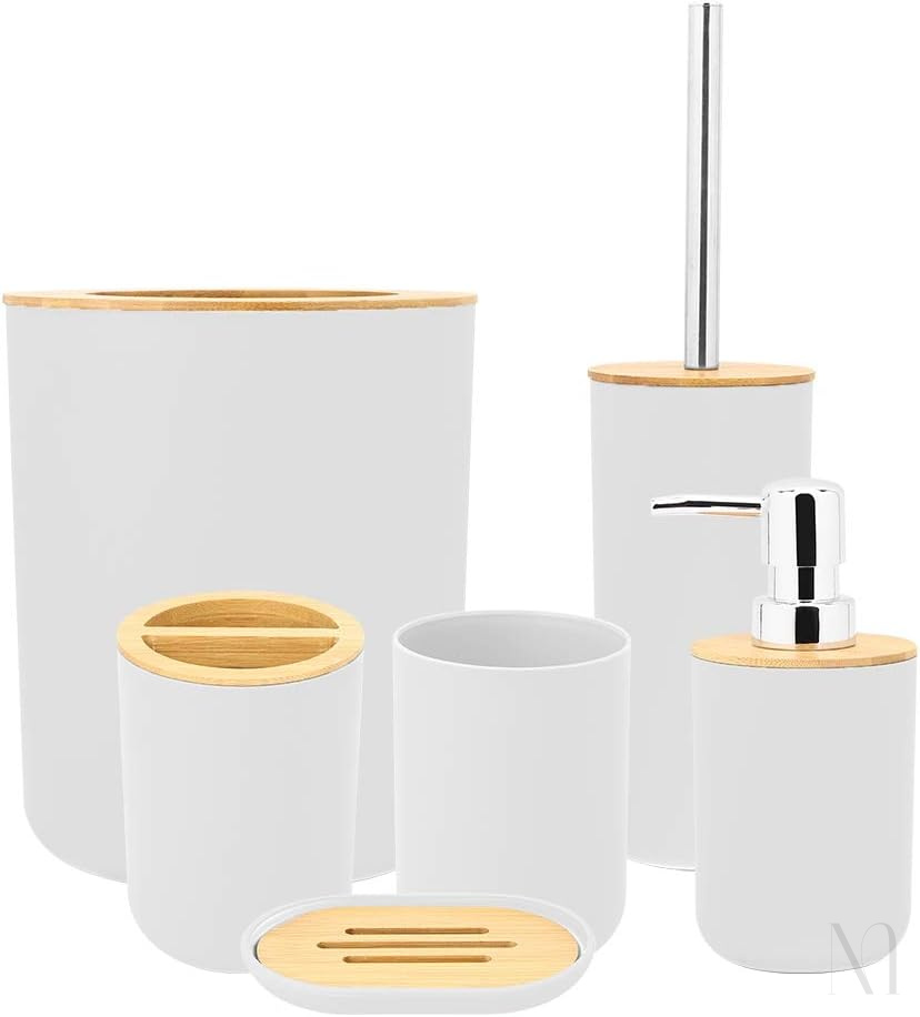 • Transform your bathroom into a luxury space with our 6pcs Bamboo Plastic Bathroom Accessories Set. Designed with a perfect blend of elegance and practicality, this set includes everything you need for an organized, modern bathroom
