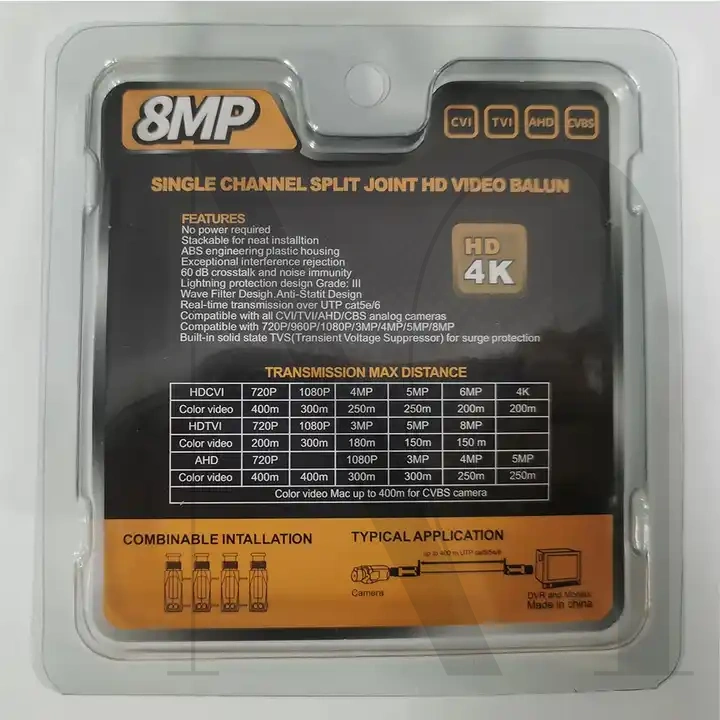 Condition: 100% Brand NewMaterial: ABSColor: BlackType: Upper PressLightning Protection Level: 3Compatible Video Signal: HD-CVI/AHD/TVI/CVBSTransmission Distance: 720P/960P/1080P≤300MTransmission Distance: 3MP/4MP/5MP/8MP≤200M