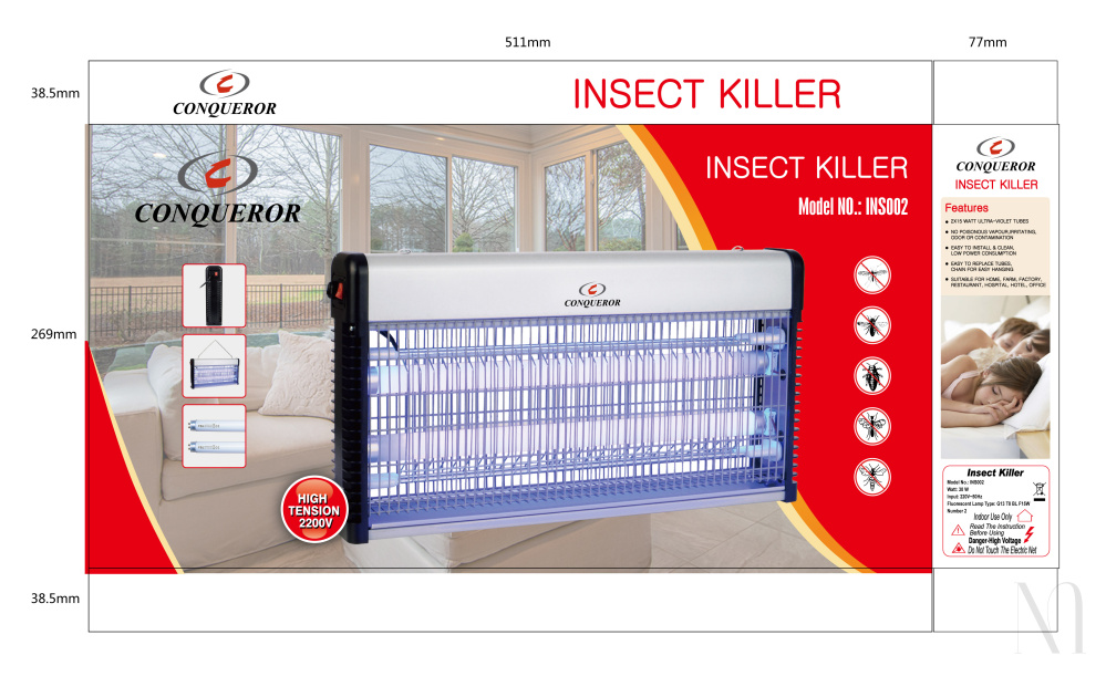 • Full open insect killer with UV-A lamps to attract insects• Suitable for home, farm, factory, restaurant, hospital, hotel, office• ABS fire resistant material for high safety, special design assures larger coverage area and higher performance• Vertical inner killing grid is galvanized metal to ensure the 100% insect killing rate• Non-Toxic, No Spray, Eco-friendly product• Indoor and Outdoor Use Positions include Wall mounted, ceiling suspended & free standing• High Tension 2200 V• Power 2 x 15 Watt• Dimensions 48.6 x 7.2 x 26.4 cm